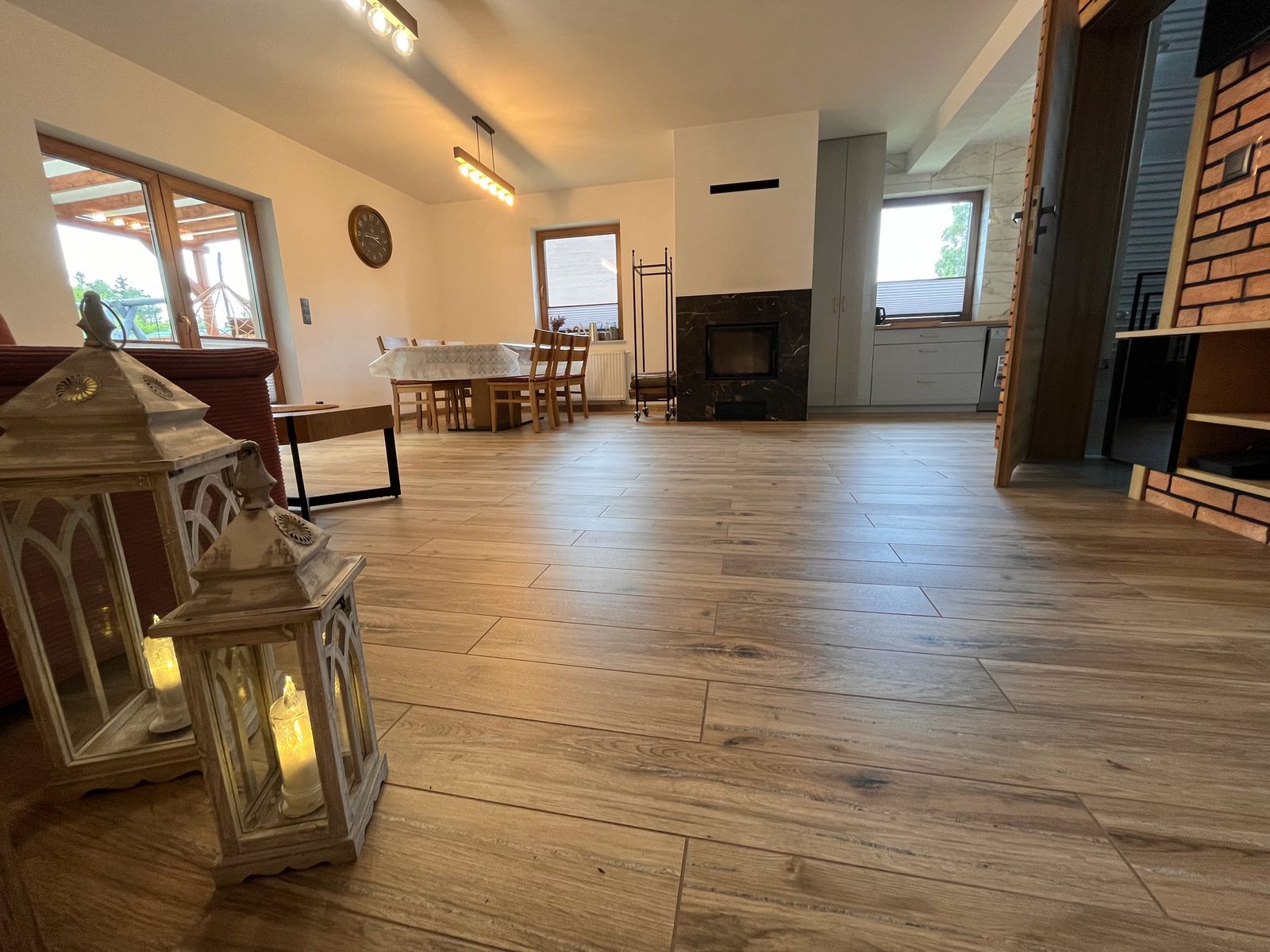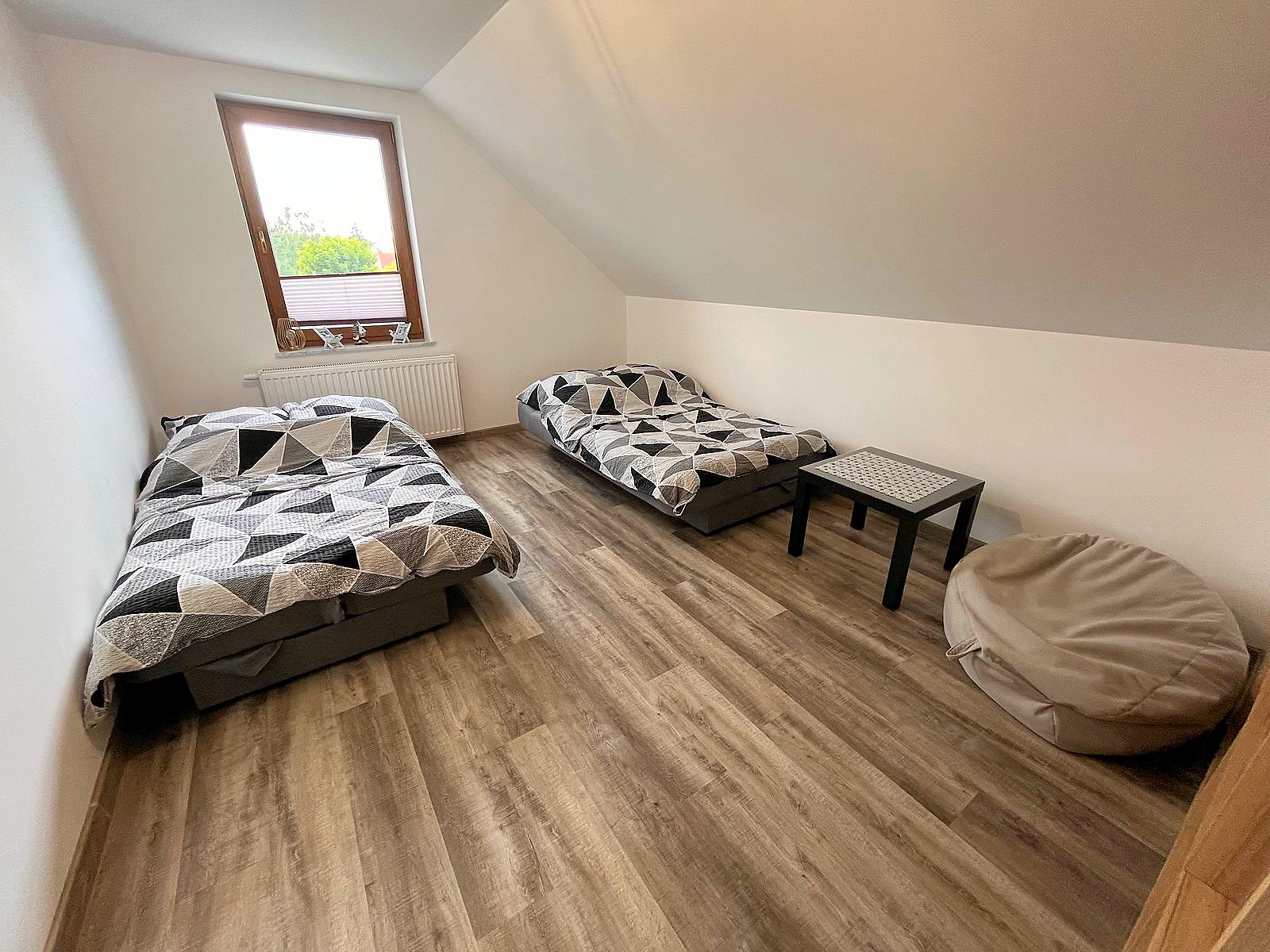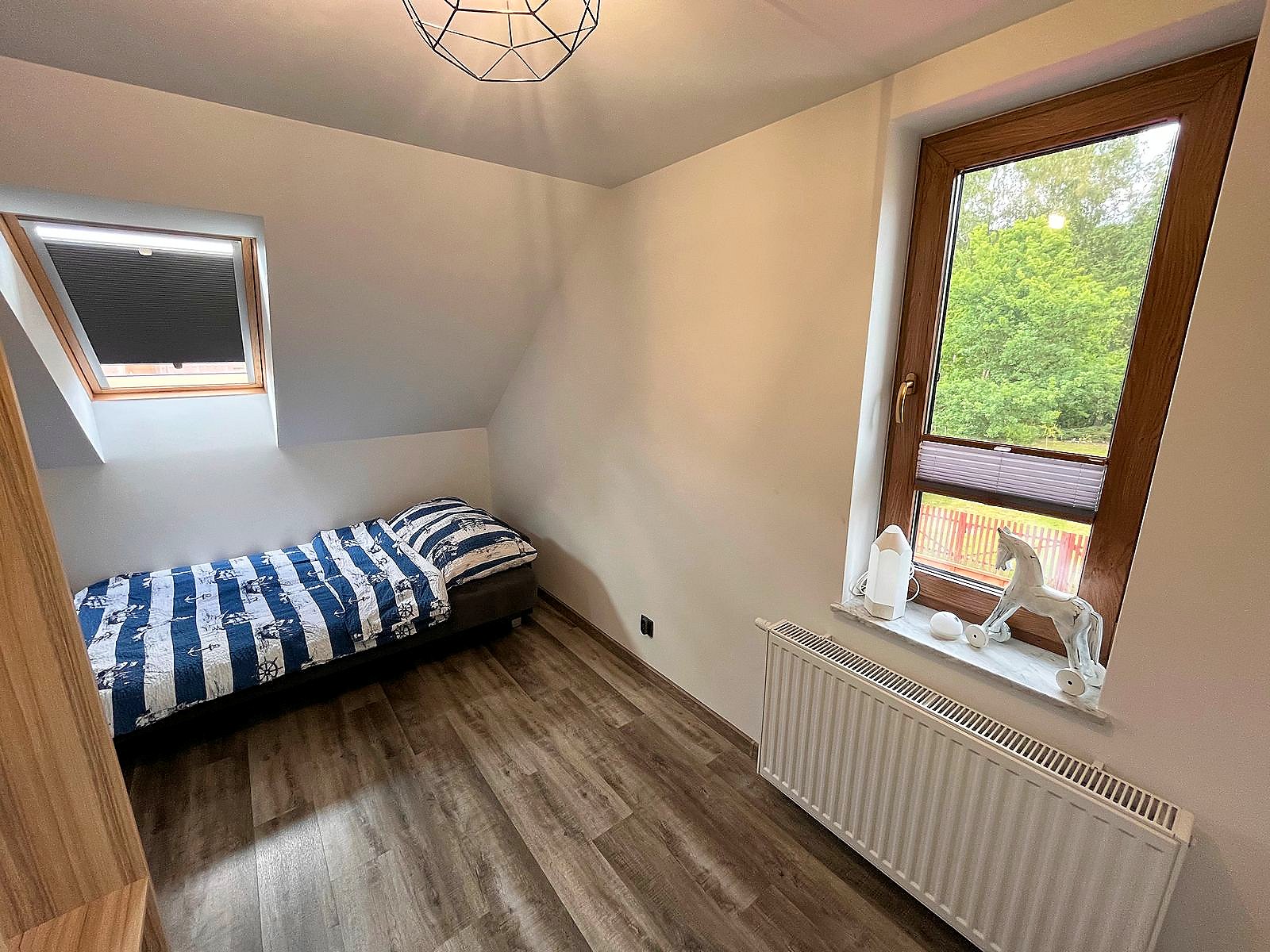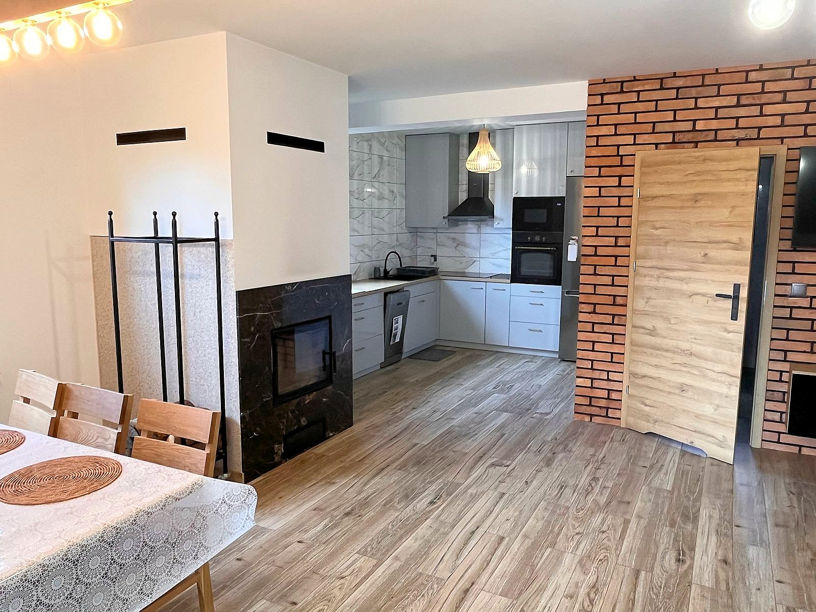 Na dole salon z aneksem jadalnym, kuchnia i łazienka. Na piętrze trzy sypialnie, dwie przeznaczone dla 2 osób oraz jedna w której znajdują się dwa łóżka przystosowana dla 4 osób. Domek ogrzewany kominkiem, który znajduje się w salonie. W pomieszczniach na piętrze znajdują się grzejniki, na dole ogrzewanie podłogowe.