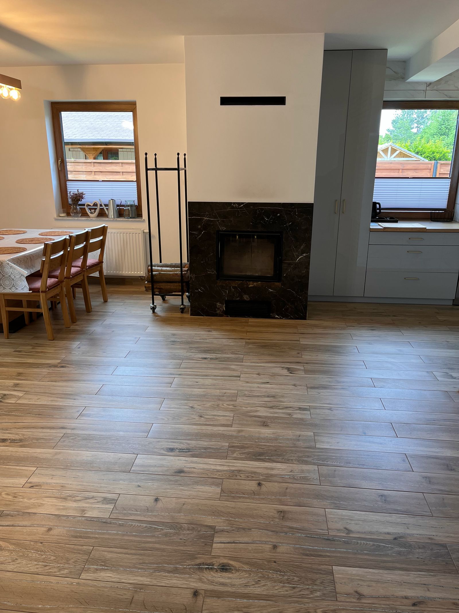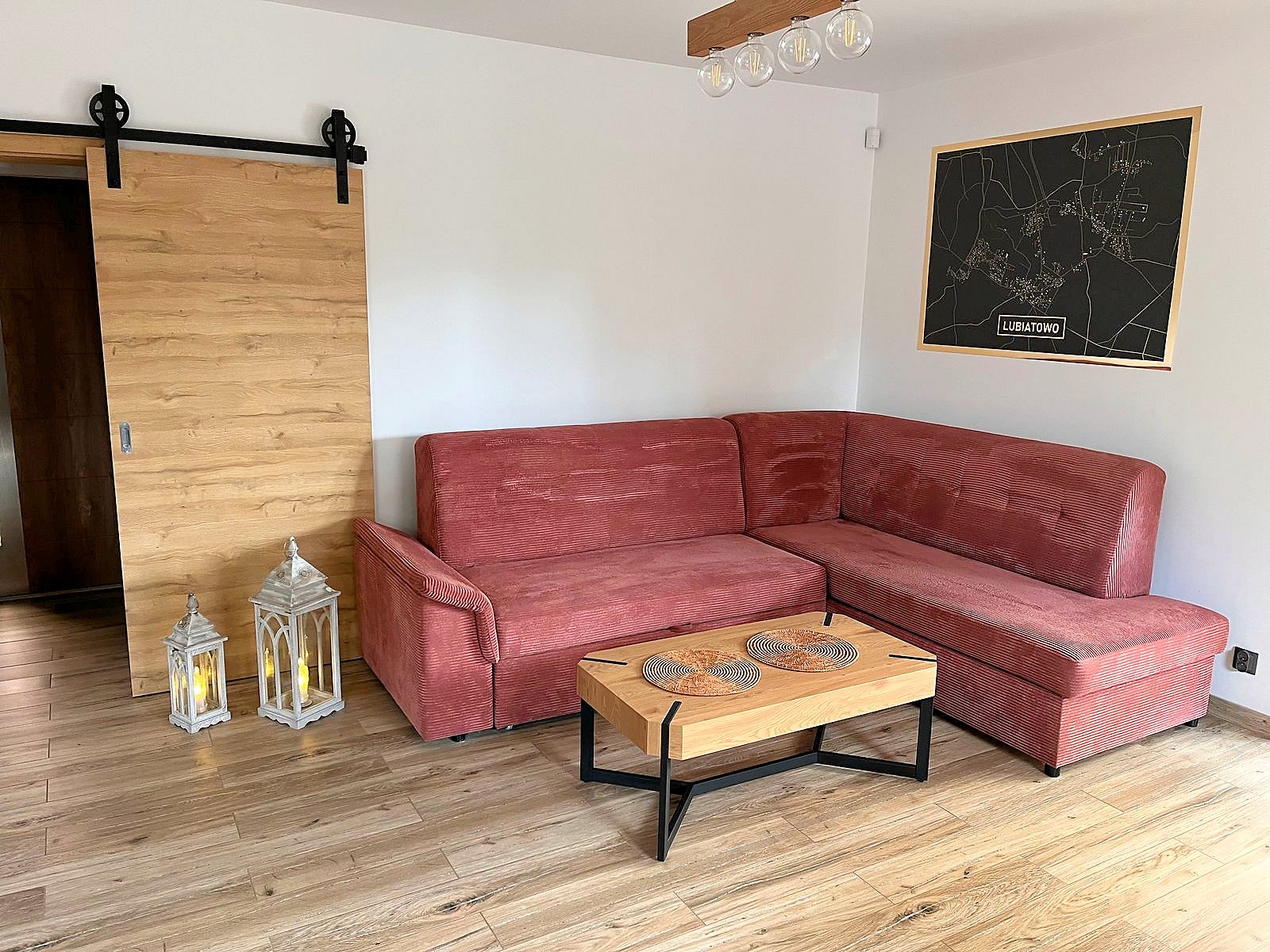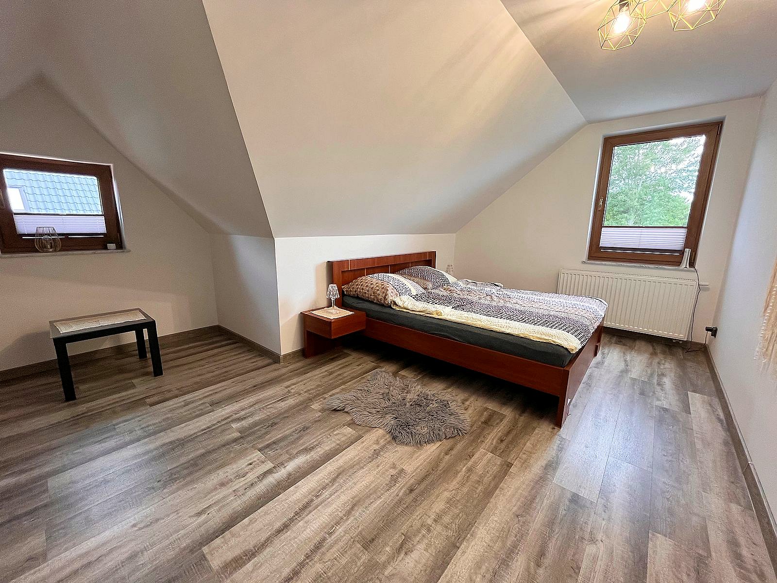 Na dole salon z aneksem jadalnym, kuchnia i łazienka. Na piętrze trzy sypialnie, dwie przeznaczone dla 2 osób oraz jedna w której znajdują się dwa łóżka przystosowana dla 4 osób. Domek ogrzewany kominkiem, który znajduje się w salonie. W pomieszczniach na piętrze znajdują się grzejniki, na dole ogrzewanie podłogowe.