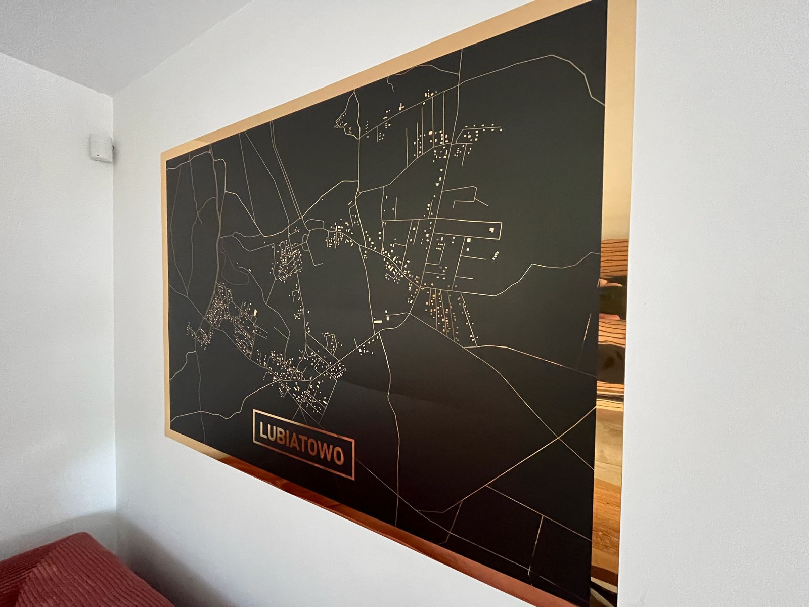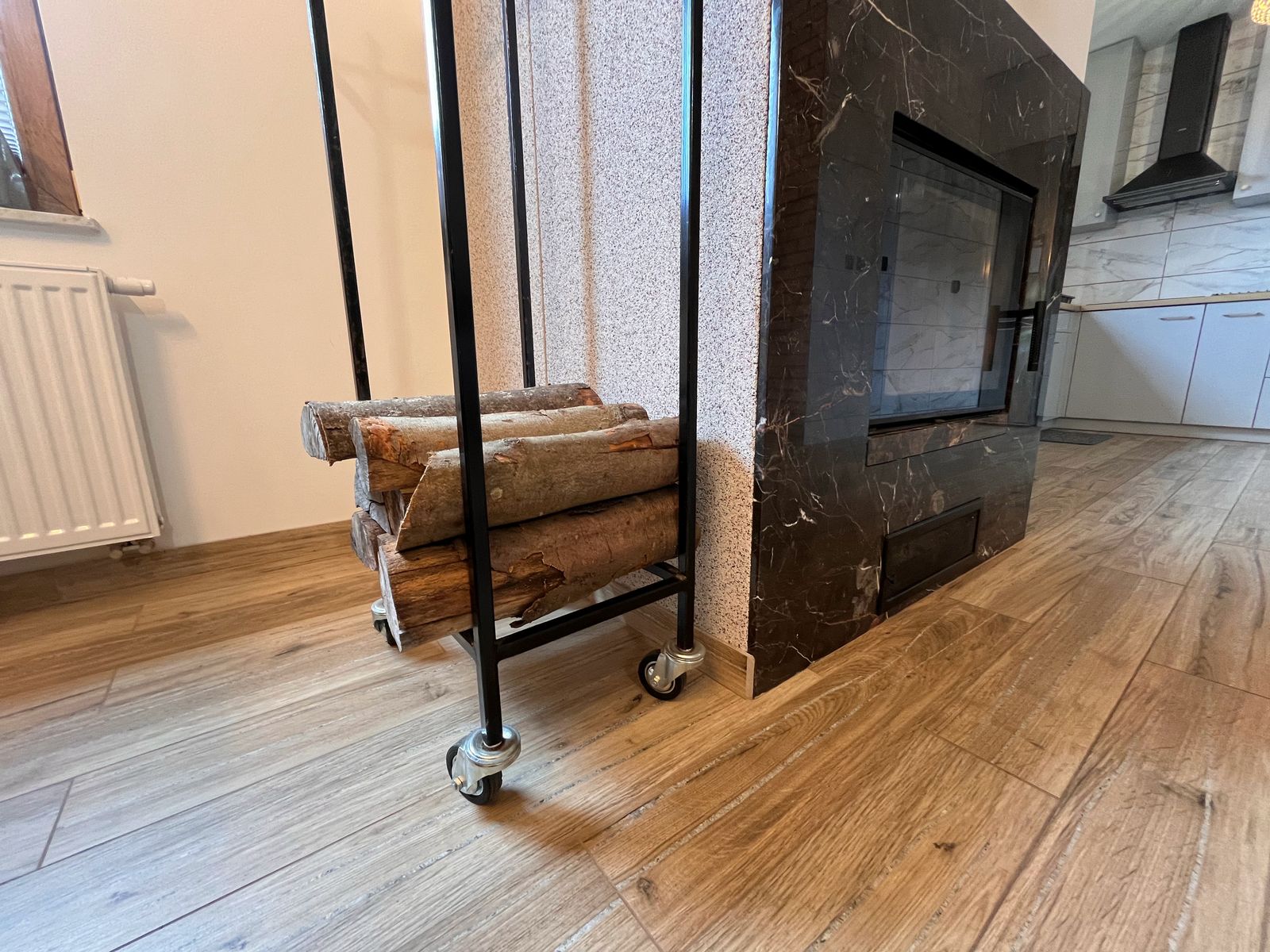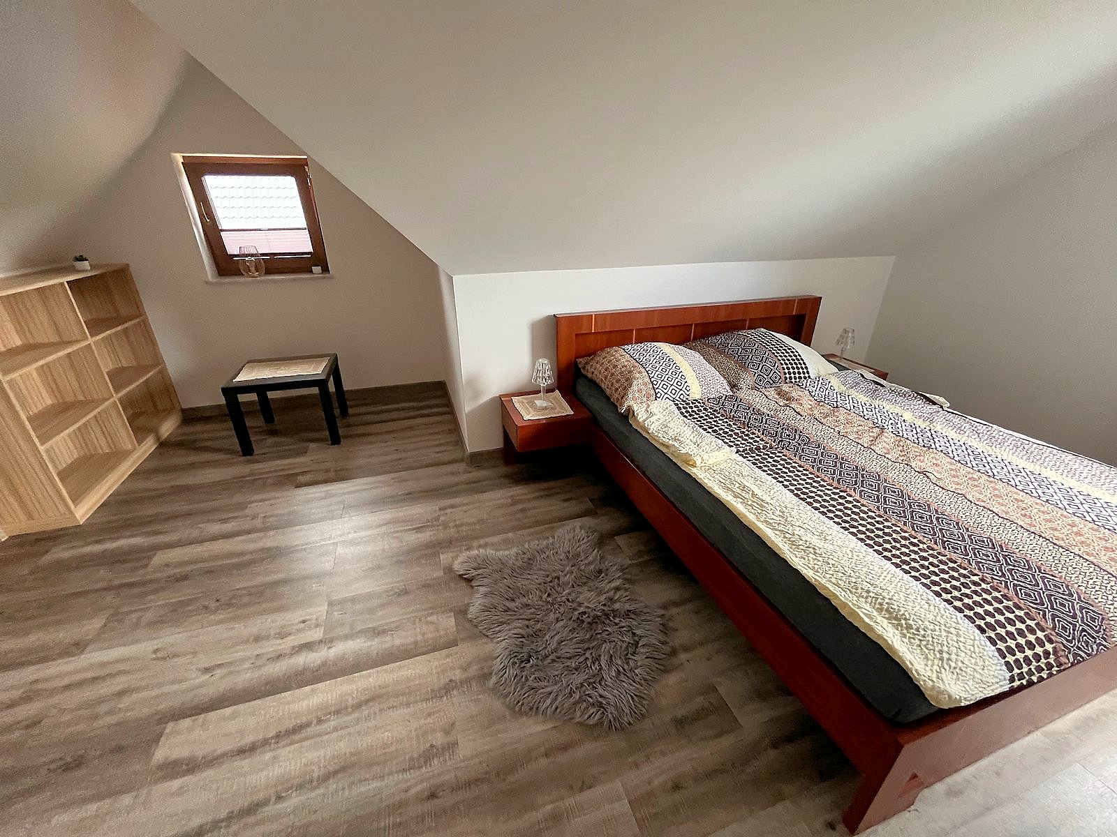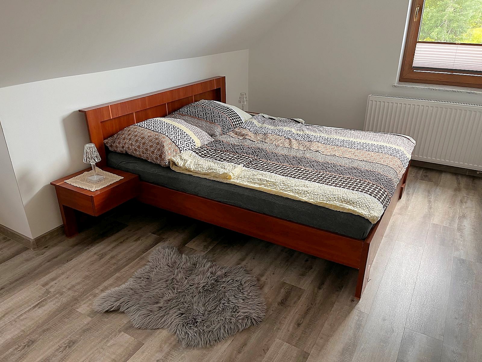 Na dole salon z aneksem jadalnym, kuchnia i łazienka. Na piętrze trzy sypialnie, dwie przeznaczone dla 2 osób oraz jedna w której znajdują się dwa łóżka przystosowana dla 4 osób. Domek ogrzewany kominkiem, który znajduje się w salonie. W pomieszczniach na piętrze znajdują się grzejniki, na dole ogrzewanie podłogowe.