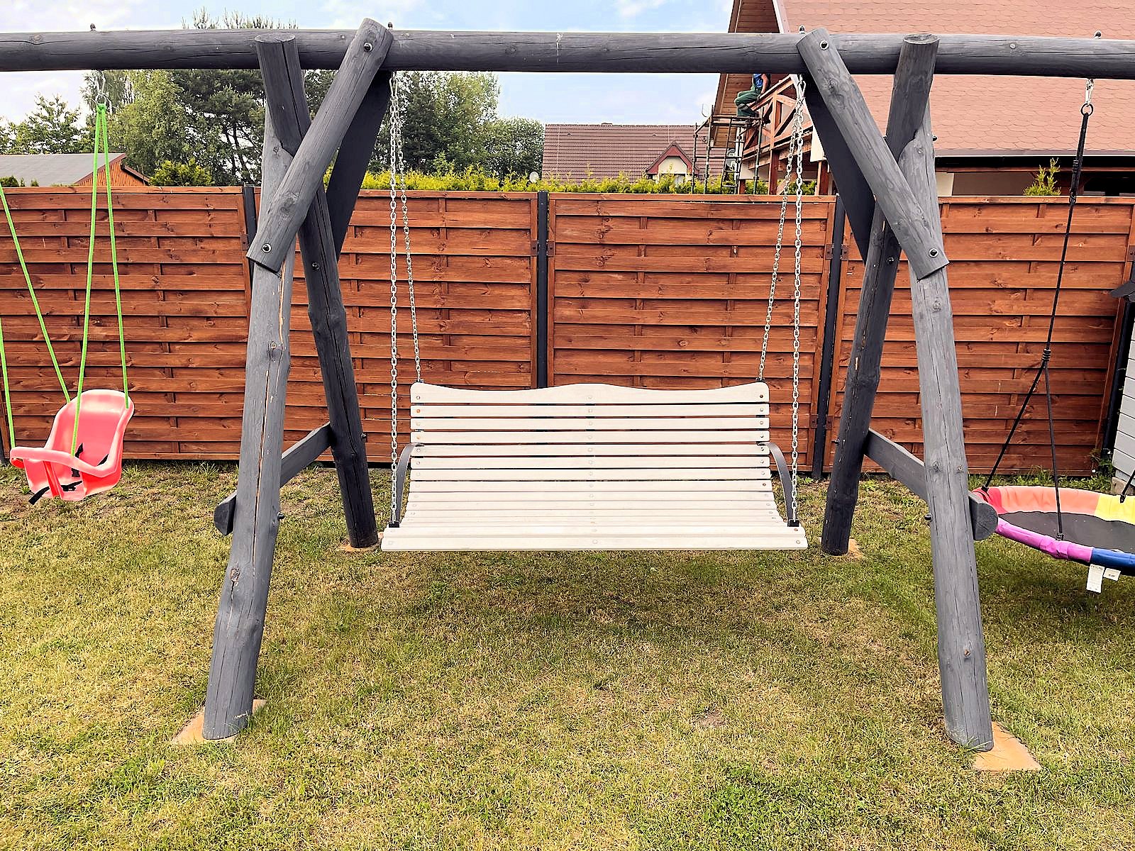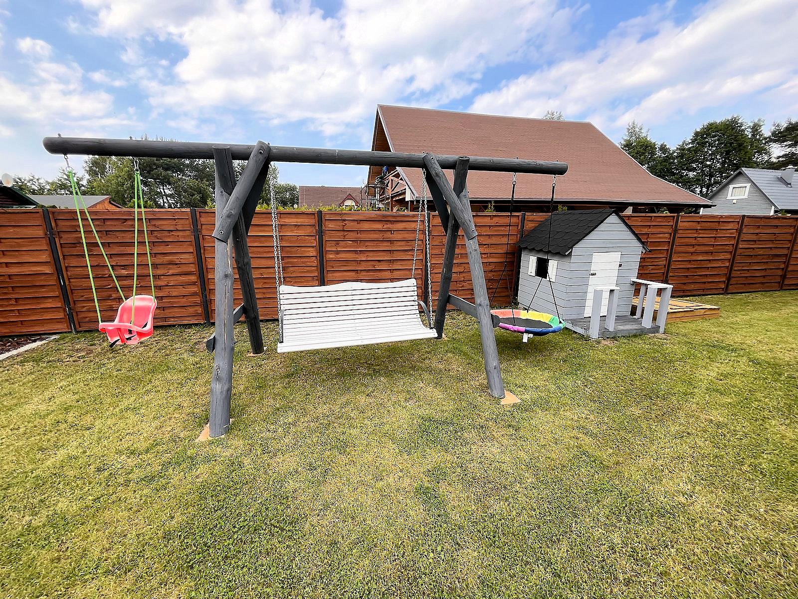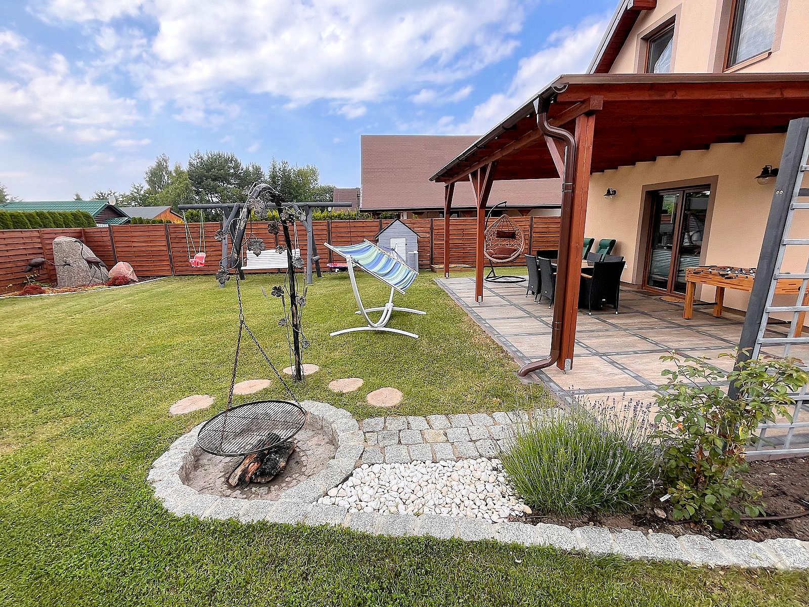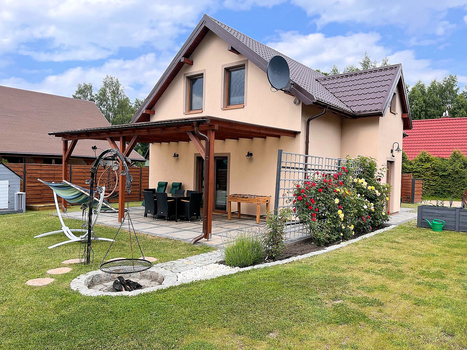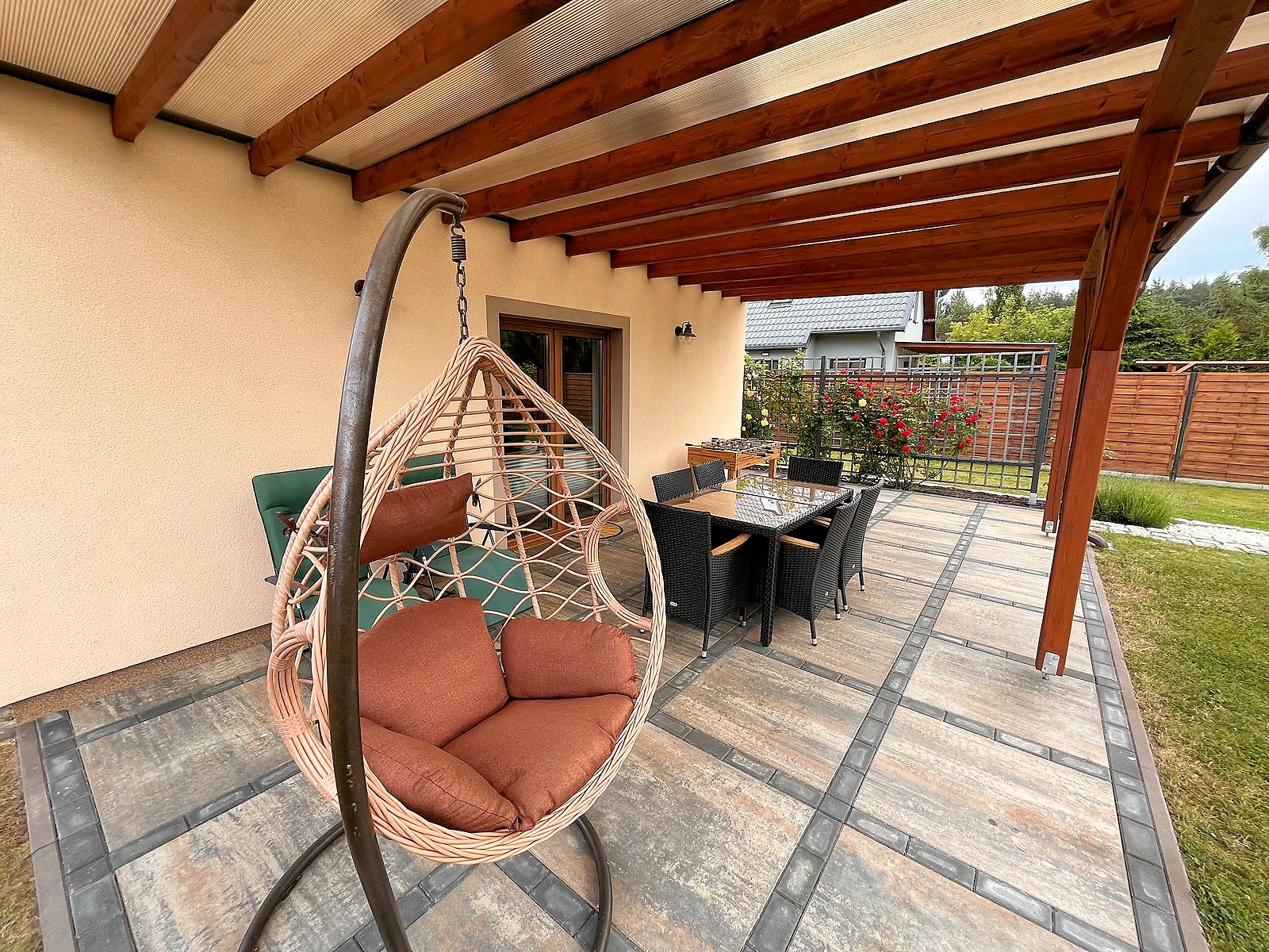 Do dyspozycji gości telewizja satelitarna, rowery oraz rowerek dla dziecka. Kuchnia w pełni wyposażona, płyta gazowa, piekarnik elektryczny oraz kuchenka mikrofalowa. W ogrodzie kącik wypoczynkowy, stół i ławki, huśtawki dla dzieci, hamak, trampolina, piaskownica, miejsce na ognisko i grilla oraz solidny stół do gry w piłkarzyki.