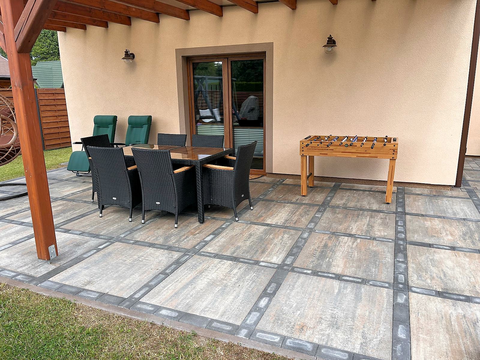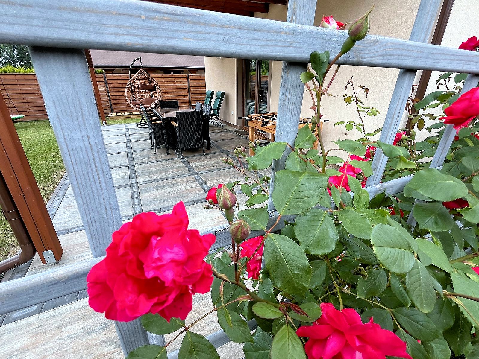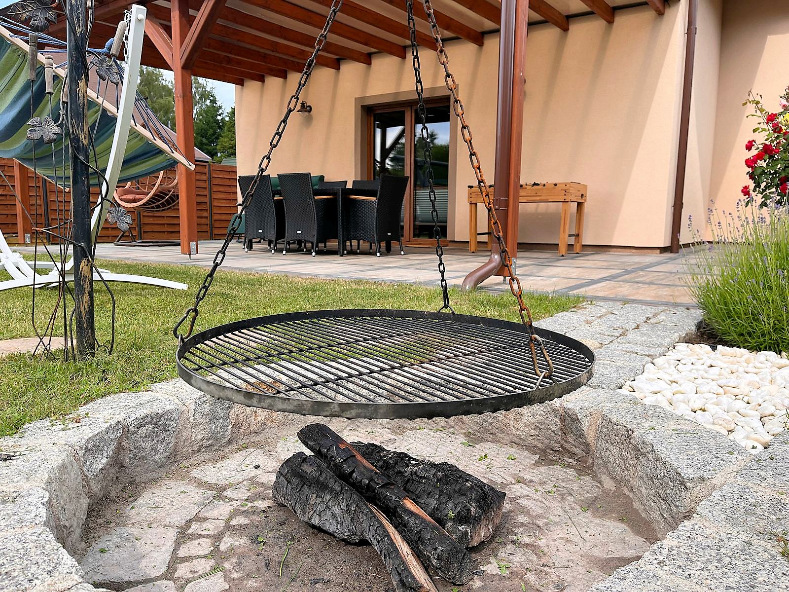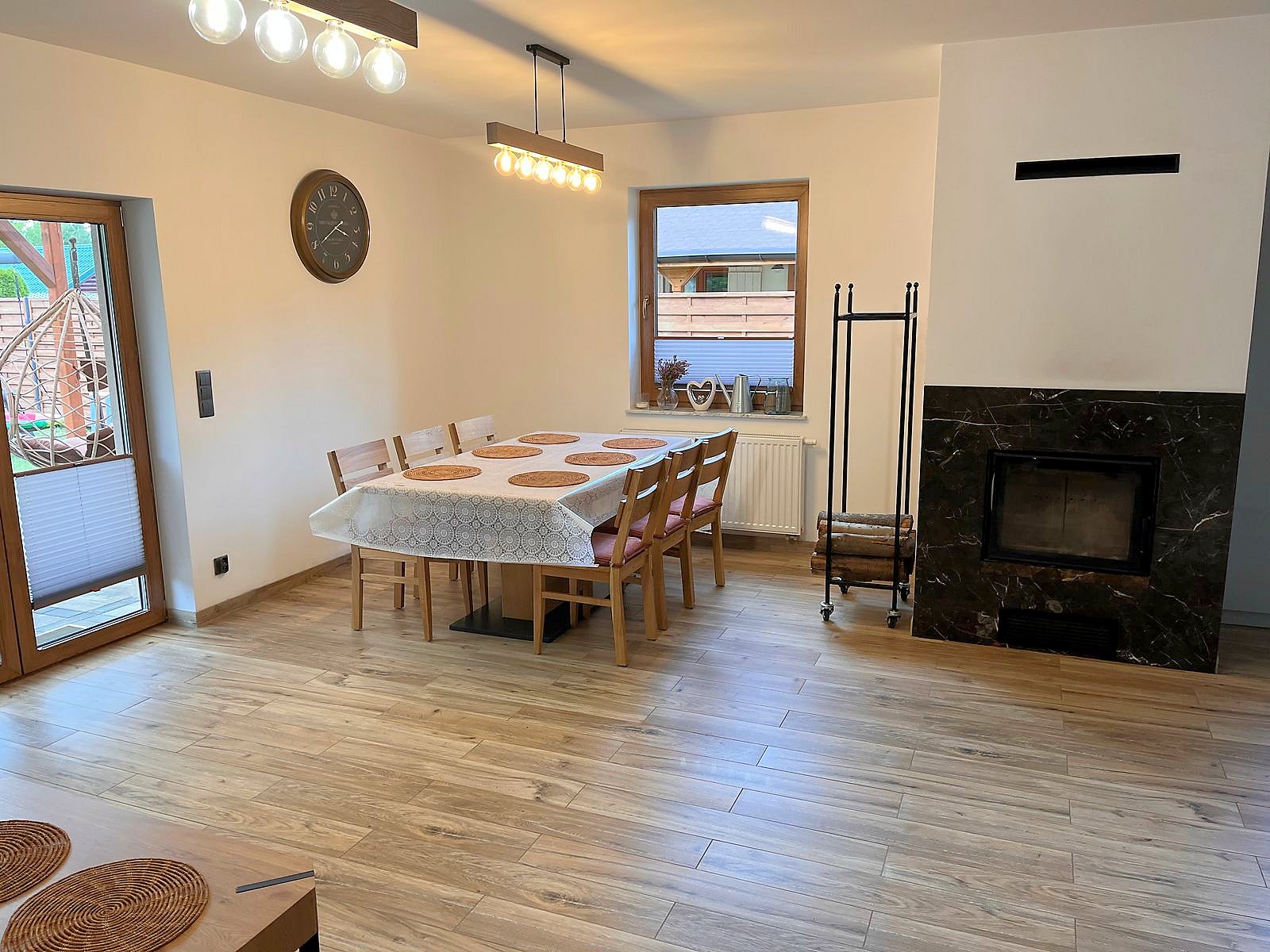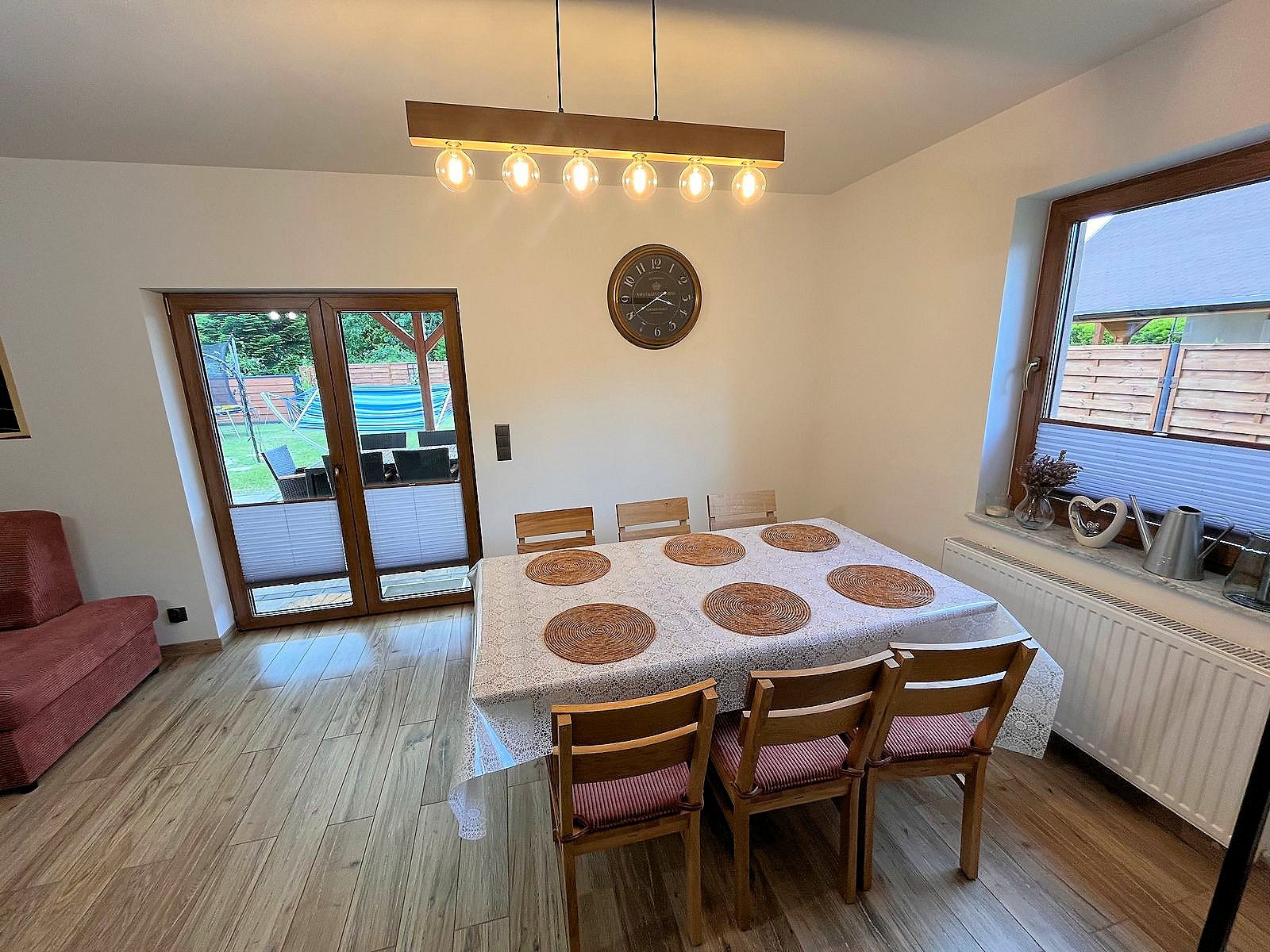 Do dyspozycji gości telewizja satelitarna, rowery oraz rowerek dla dziecka. Kuchnia w pełni wyposażona, płyta gazowa, piekarnik elektryczny oraz kuchenka mikrofalowa. W ogrodzie kącik wypoczynkowy, stół i ławki, huśtawki dla dzieci, hamak, trampolina, piaskownica, miejsce na ognisko i grilla oraz solidny stół do gry w piłkarzyki.