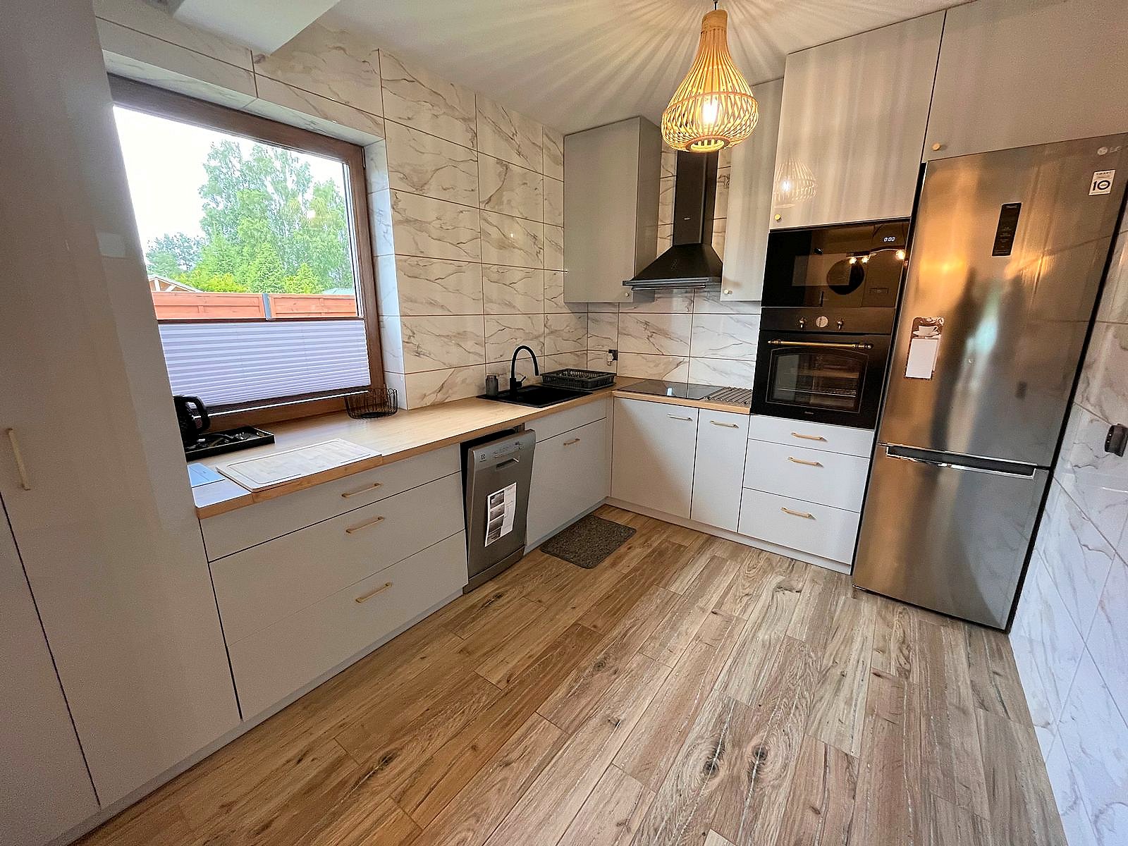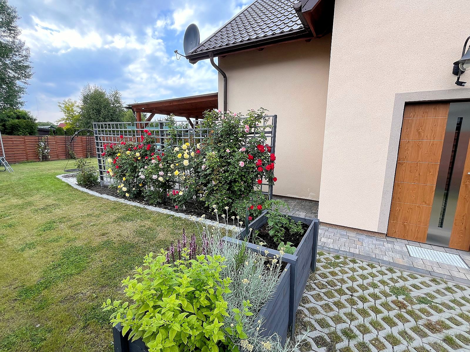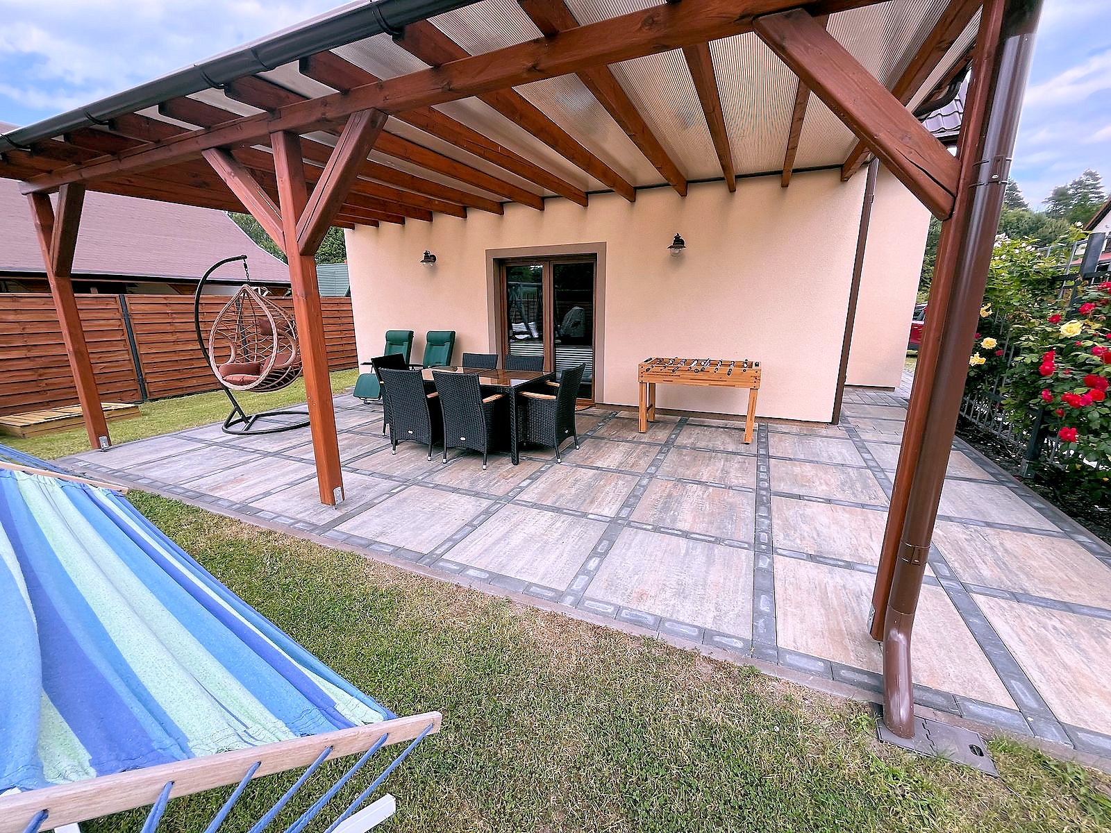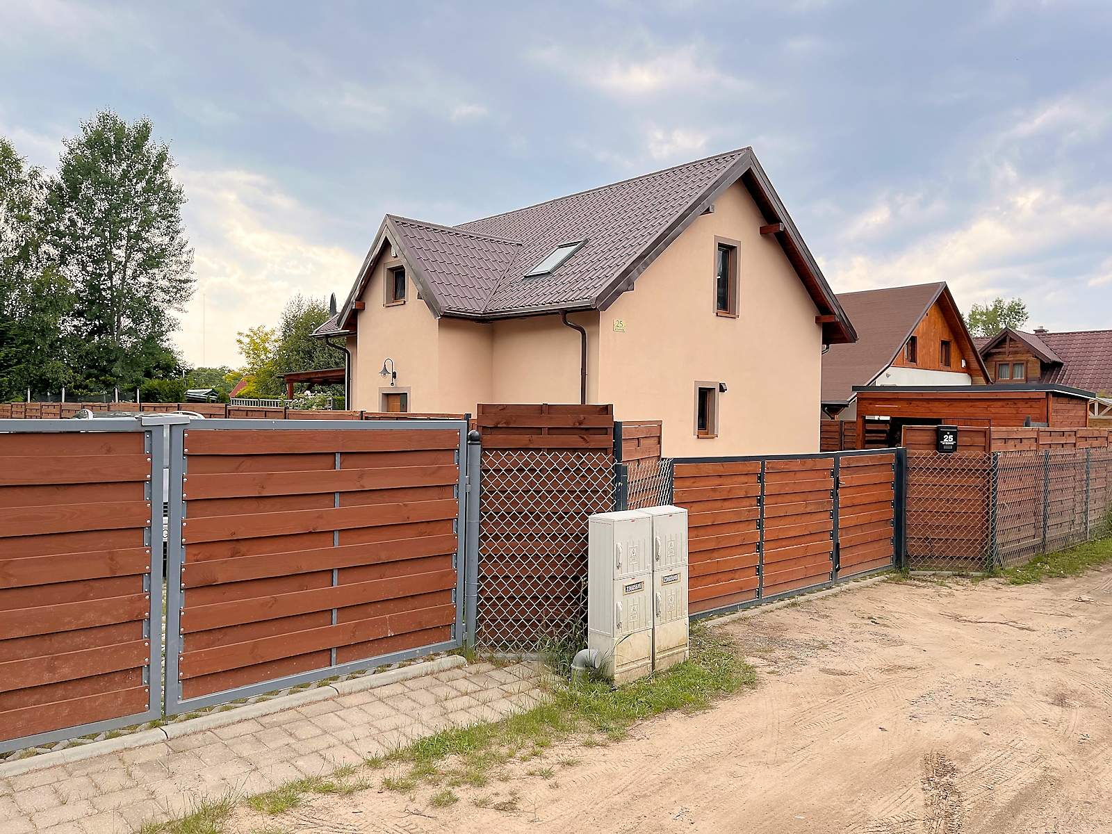 Domek całoroczny, znajduje się na samodzielnej posesji na małym osiedlu. Teren jest ogrodzony, wewnątrz ogród z miejscem do wypoczynku oraz podjazd na 3 samochody.
